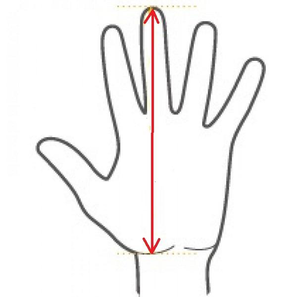 Zmierz swoją rękę od pierwszego zagniecenia na nadgarstku do końcówki twojego środkowego palca. Na podstawie wyniku pomiaru, wybierz produkt zgodnie z zestawieniem rozmiarów: