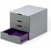 Stylowy i innowacyjny pojemnik z 4 kolorowymi szufladami z wysokiej jakości tworzywa sztucznego. 2 duże szuflady w rozmiarze XXL oferują sporo miejsca. Delikatne kolorowe linie na brzegach frontów szuflad są pomocne przy porządkowaniu dokumentów. Cicho i lekko wysuwające się szuflady posiadają blokady. Szuflady przeznaczone na dokumenty do formatu A4, C4 oraz mniejszych rozmiarów jak Folio oraz A5. Na frontach szuflad znajdują się przezroczyste okienka z etykietami, które można opisać także komputerowo. Etykiety wymienia się w prosty sposób. Pojemniki można wykorzystywać we wszystkich standardowych regałach oraz szafach biurowych. Można je także ustawiać jeden na drugim dzięki antypoślizgowym stopkom z tworzywa. Wymiary: 280 x 292 x 356 mm (szer. x wys. x głęb.)