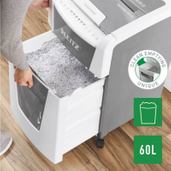 W pełni automatyczna niszczarka do papieru firmy Leitz z unikalną funkcją samooczyszczania. Tak inteligentna, że wystarczy włożyć stos kartek (w tym ze zszywkami i spinaczami), zamknąć pokrywę i można wracać do swoich zajęć, a ona, cicho pracując, wykona samodzielnie zadaną pracę. Idealna do użytku biurowego. Gwarantuje doskonałą wydajność - zapobiega zacięciom, jest cicha i może pracować przez 60 minut bez przerwy. Jednorazowo niszczy automatycznie do 300 kartek formatu A4, tnąc je na mikrościnki o poziomie bezpieczeństwa P-5 (2 x 15 mm) i umieszczając pocięte arkusze w dużym, 60-litrowym pojemniku. Dotykowy panel sterowania gwarantuje łatwą i intuicyjną obsługę urządzenia.