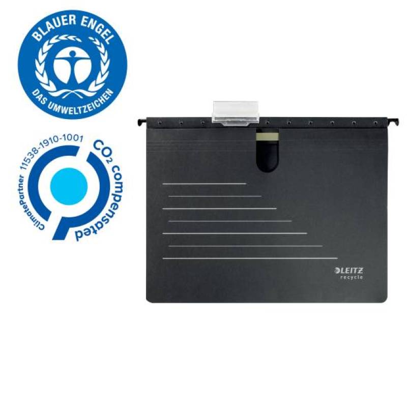 Najwyższej jakości atrakcyjny skoroszyt zawieszany, na dokumenty w formacie A4. Wykonany z kartonu pochodzącego w 100% z recyklingu, neutralny dla klimatu, w 100% nadający się do ponownego przetworzenia, z certyfikatem środowiskowym Blue Angel. Zapewnij sobie uporządkowany i łatwy dostęp do dokumentów oraz wykorzystaj maksymalnie miejsce do archiwizacji dzięki możliwości pionowego zawieszania dziurkowanych dokumentów. Mocne, trwałe zawieszki wytrzymają intensywne użytkowanie, a dołączony uchwyt na etykiety pomaga w porządkowaniu i identyfikacji zawartości. Solidne zawieszane skoroszyty wykonane są z jakością zapewniającą użytkowanie przez długie lata. Idealnie uzupełnią inne produkty z kolekcji Leitz Recycle, zawierającej nowoczesne i ekologiczne produkty biurowe świetnie prezentujące się w domu i w biurze. Dzięki nowej, przyjaznej dla środowiska linii produktów Recycle oferowanej przez firmę Leitz możesz polepszyć zarówno swoje środowisko biurowe, jak i całej naszej planety.