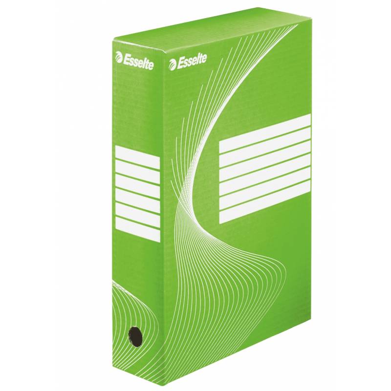 Miejsce do opisu zawartości na grzbietach i bocznej ściance. Otwór na palec ułatwia wkładanie i wyjmowanie pudełka z półki. Pudełka można ustawiać w regale lub wkładać do kontenerów (te mieszczą odpowiednio 6 lub 5 sztuk pudełek). Dodatkowo różne kolory pudełek ułatwiają archiwizowanie. Grzbiet 80 mm, pojemność 800 kartek. Wymiary 355x81x250