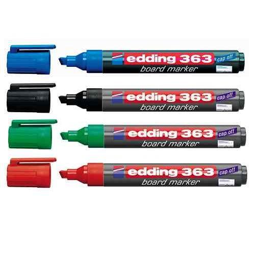 Markery do białych tablic suchościeralnych, ścieralne na sucho,nawet po kilku tygodniach,bez pozostawiania śladów, praktycznie z każdej gładkiej powierzchni, tj. powierzchnie emaliowane,szklane, melaminowe.Model e-363 z ściętą końcówką o grubości 1-5mm.