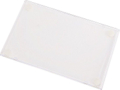 Tabliczka informacyjna wykonana z pleksy; małe zaczepy wokół obwodu przytrzymują kartę i folię zabezpieczającą; może być naklejona na drzwi, szybę; na specjalne zamówienie dostępne w kolorach czerwonym, niebieskim.