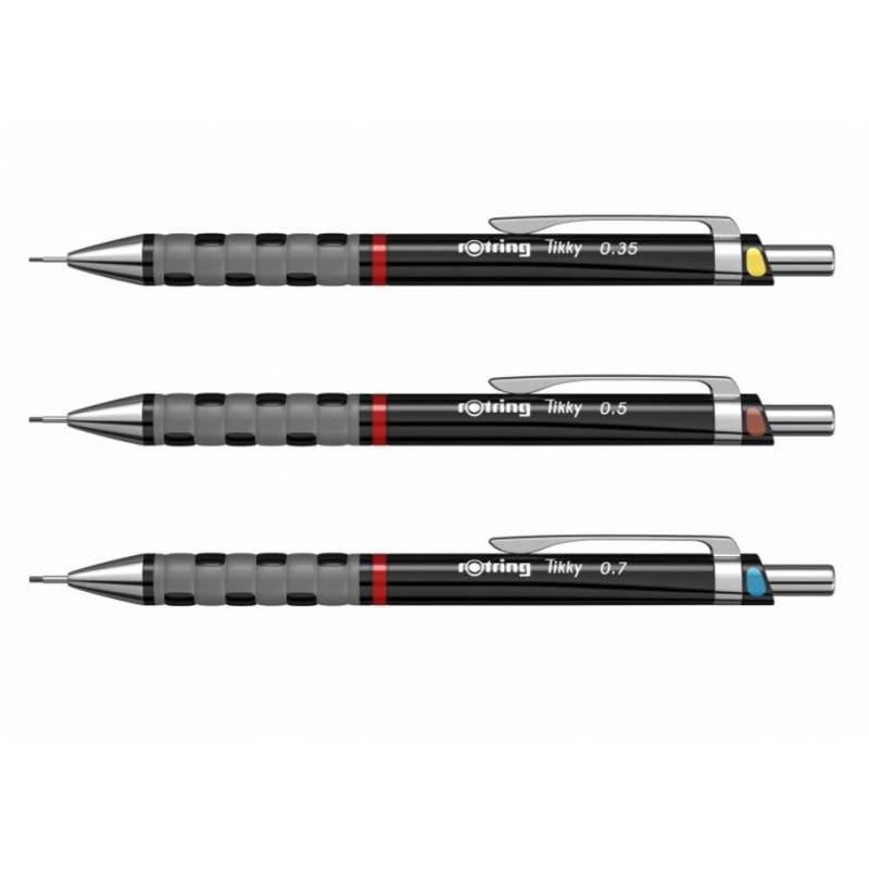 Automatyczny ołówek techniczny i długopis. Delikatnie karbowany korpus umożliwia pewny uchwyt. Przycisk, klip oraz rurka końcówki są pokryte warstwą ochronną zapobiegającą powstawaniu nalotu. Rurka końcówki umożliwia doskonałą widoczność papieru, idealnie nadaje się do kreślenia z zastosowaniem liniałów i szablonów. Tikky to idealne narzędzie do rysunków i szkiców technicznych. Obudowa o przekroju trójkątnym nadaje nowoczesny wygląd, metalowy klips zamocowany na pierścieniu. Połączenie miękkiego i twardego tworzywa oraz pofalowany uchwyt zapewniają wygodne i luźne położenie palców dla precyzyjnego rysowania i pisania. Kolor obudowy czarny.
