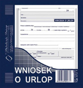Druk stanowiący wniosek o urlop w formacie A6. Wzór wniosku wykonany z papieru offsetowego. Druk jednostronny, 40 kartkowy.