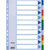 Przekładki z kartą opisową w 10 kolorach, wykonane ze sztywnego kartonu. Uniwersalna perforacja brzegu pasuje do każdego rodzaju segregatora. Format A4. 10 kart w komplecie.